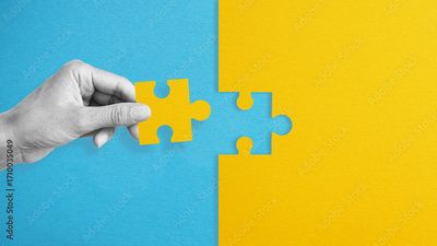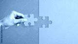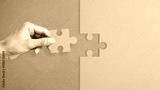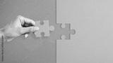 The hand Inserts last puzzle piece to finish work as concept of completing the steps and success. Completion of the work or problem solution