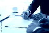 Close up image of businessman hand putting personal signature on contract document in presence of business partner. Starting successful partnership with entrepreneur or companie, making good deal