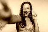 Young woman posing playfully with peace sign and sticking out tongue indoors