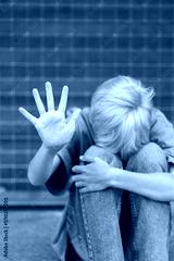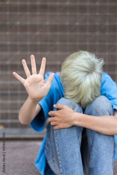 Lonely teenager showing a stop sign sitting on the floor
