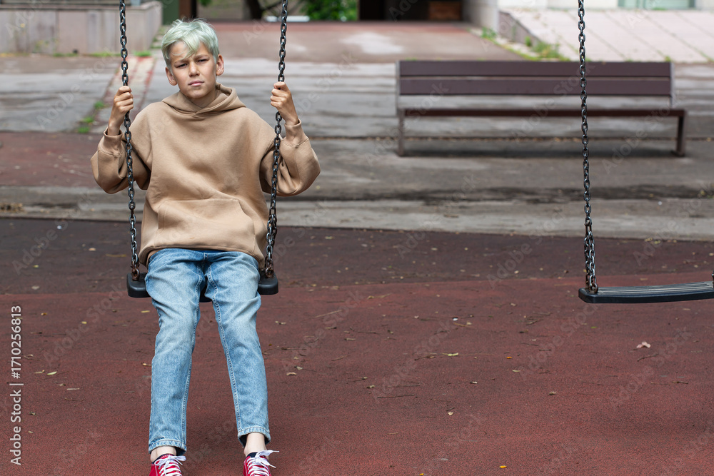 Handsome teenager swinging at the playground outdoors