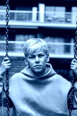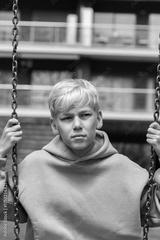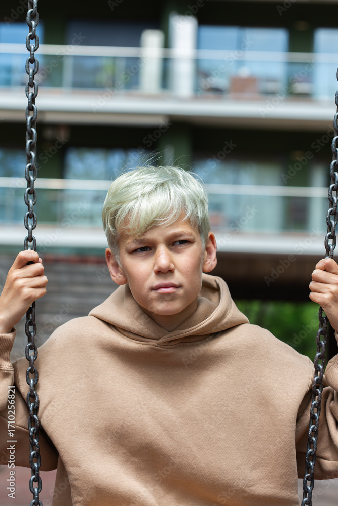 Handsome teenager swinging at the playground outdoors