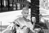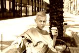 Teenager drinking coffee to go sitting on a bench outdoors