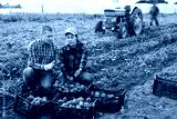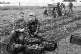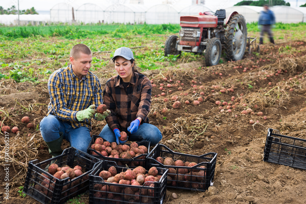 Asian woman and European man farmers squatting near boxes of potatoes on vegetable field.