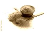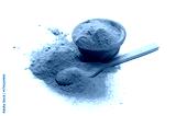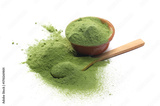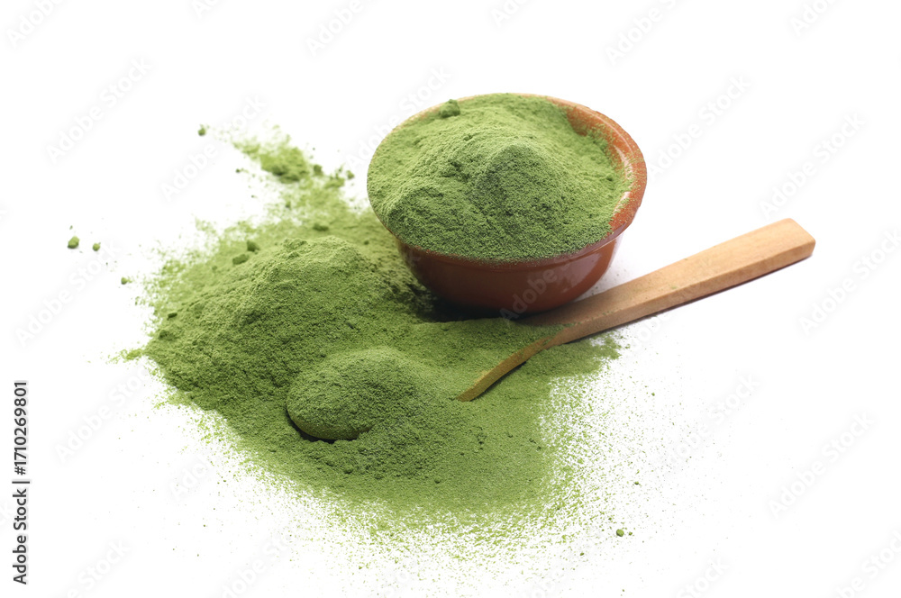 Young barley grass, green powder in clay pot and wooden spoon, isolated on white background, side view
