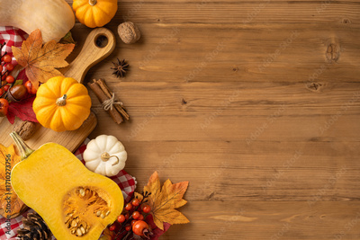 Top view of a Thanksgiving arrangement with pumpkins, autumn leaves, spices, and wooden background