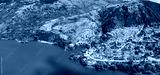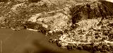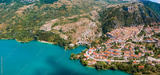 Italy tourism. Medieval scenic Barrea village and beautiful turquoise lake in Sangro Valley. National Park of Abruzzo and Molise. aeriald drone view. Italian scenery and postcard idyllic places