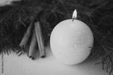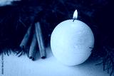 winter still life. Burning candle, cinnamon sticks and fir branches