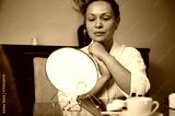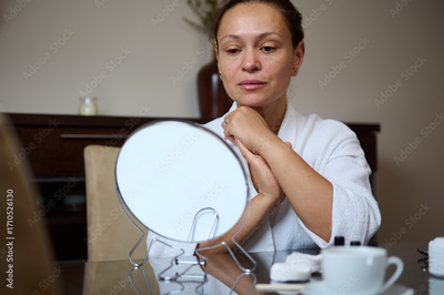 Woman Contemplating Before a Mirror in a Relaxed Indoor Setting