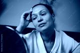 Thoughtful Woman in White Bathrobe Reflecting in Front of a Mirror