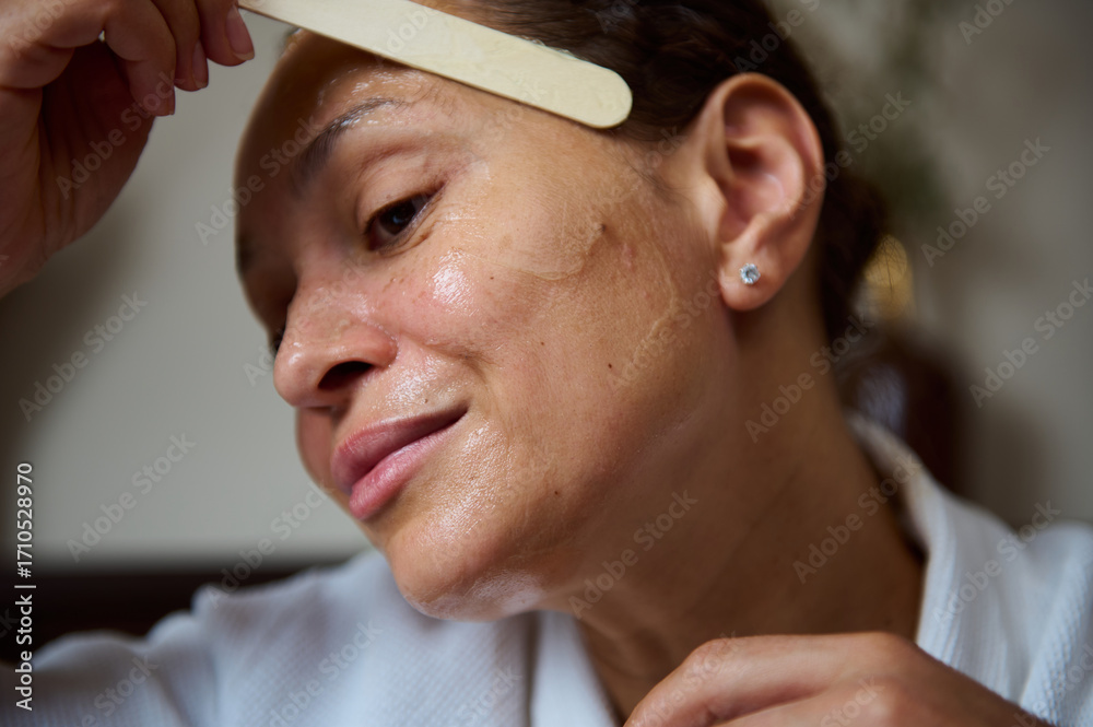 Woman Applying Facial Treatment with Spatula in Relaxing Spa Setting