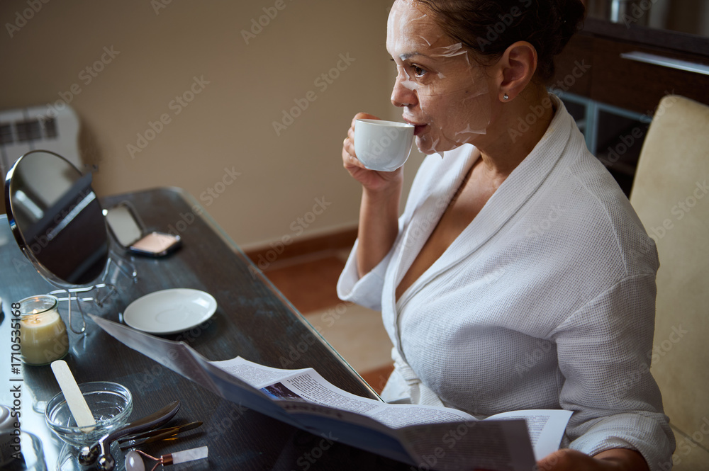 Woman Relaxing With Facial Mask, Sipping Coffee, and Reading a Newspaper