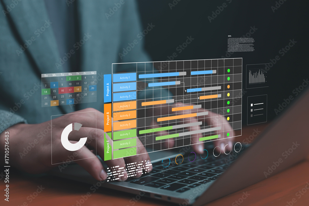 Businessman using laptop with digital project management dashboard, showing chart, calendar, and data visualization, symbolizing workflow planning, productivity, scheduling, and business efficiency.