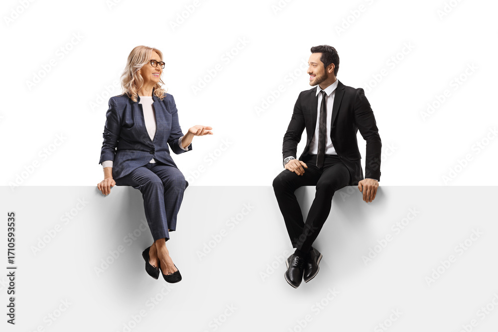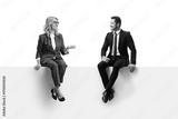 Woman talking to a businessman and sitting on a blank panel