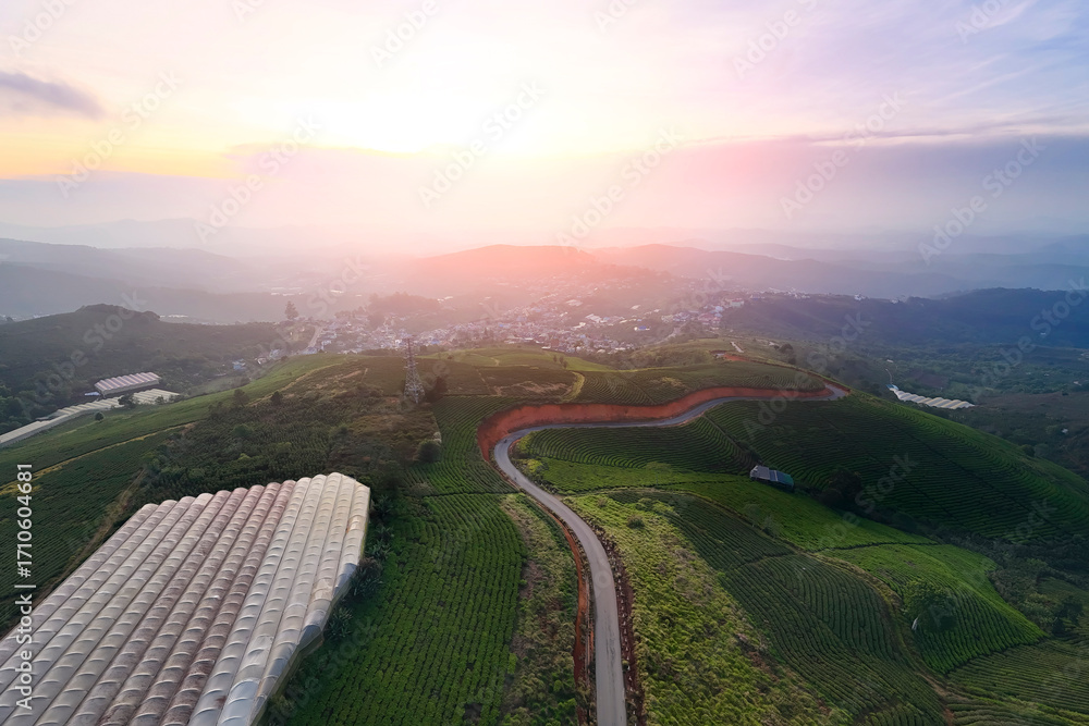Tea plantations cover rolling hills near a small Village. A winding road cuts through the landscape toward the town. Greenhouses are visible, with a sunrise in the distance