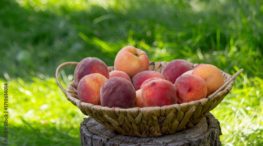 fresh ripe peaches on a stump against a garden background