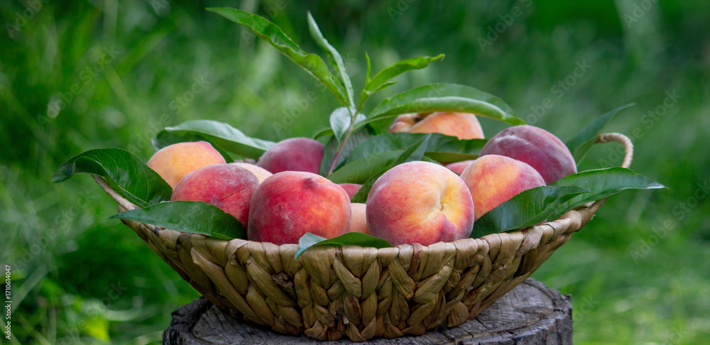 fresh ripe peaches on a stump against a garden background