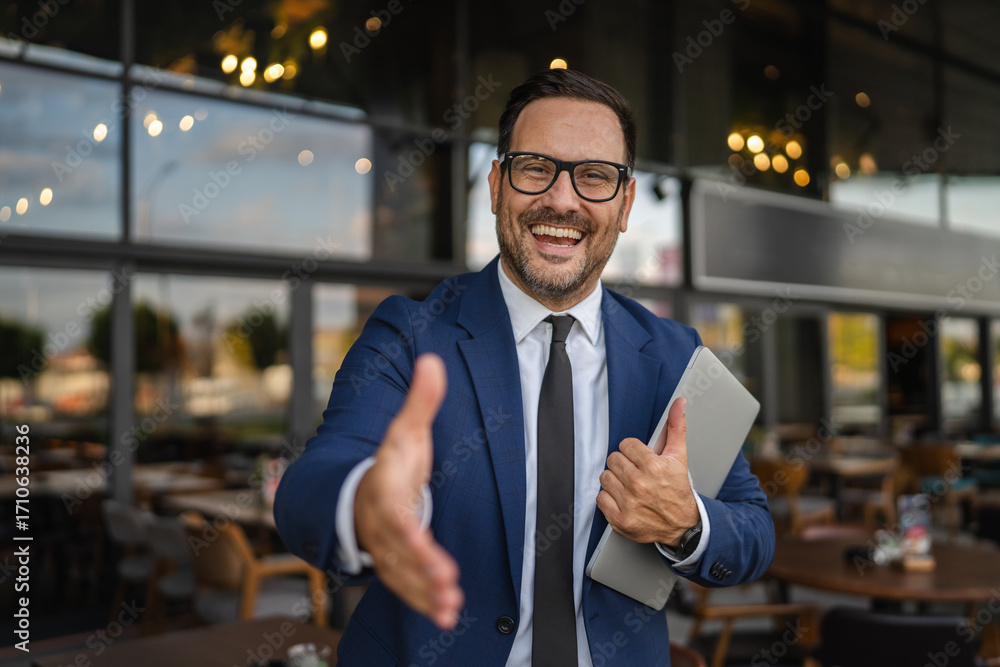 Businessman offering handshake in front of restaurant holding laptop