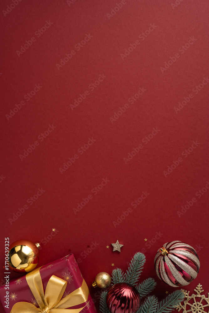 Christmas-themed vertical setup featuring red and gold decorations, a gift with ribbon, and festive ornaments on a vibrant red background