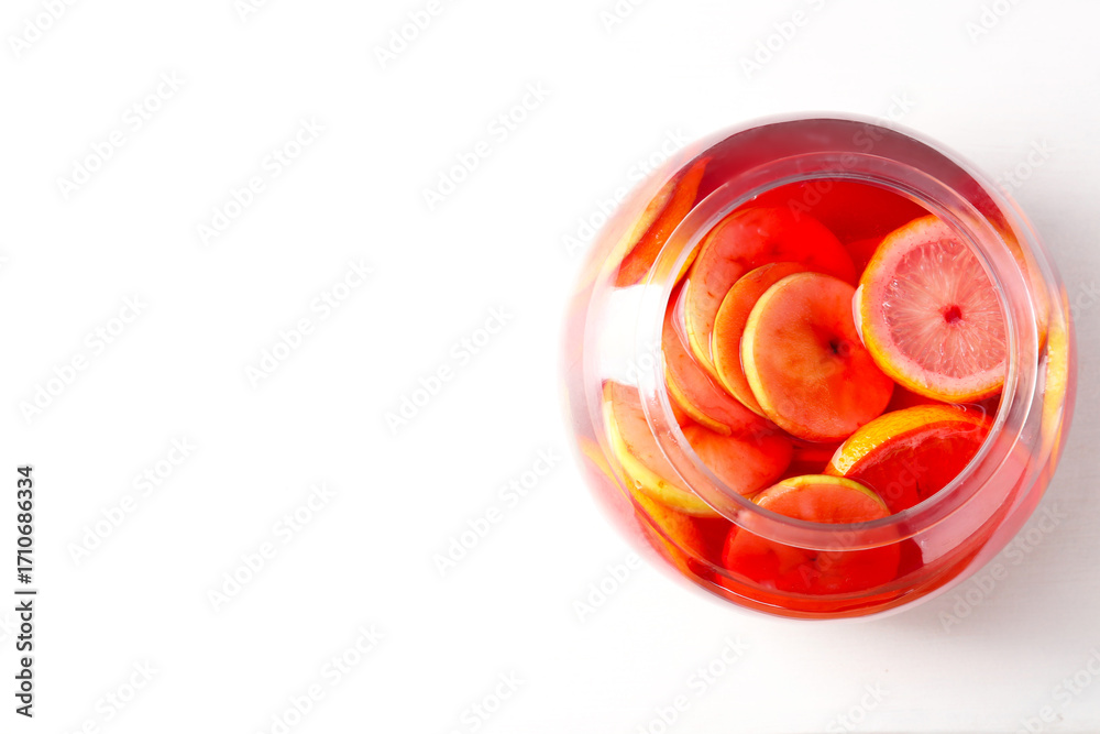 Tasty fruity punch on white table, top view with space for text. Refreshing drink