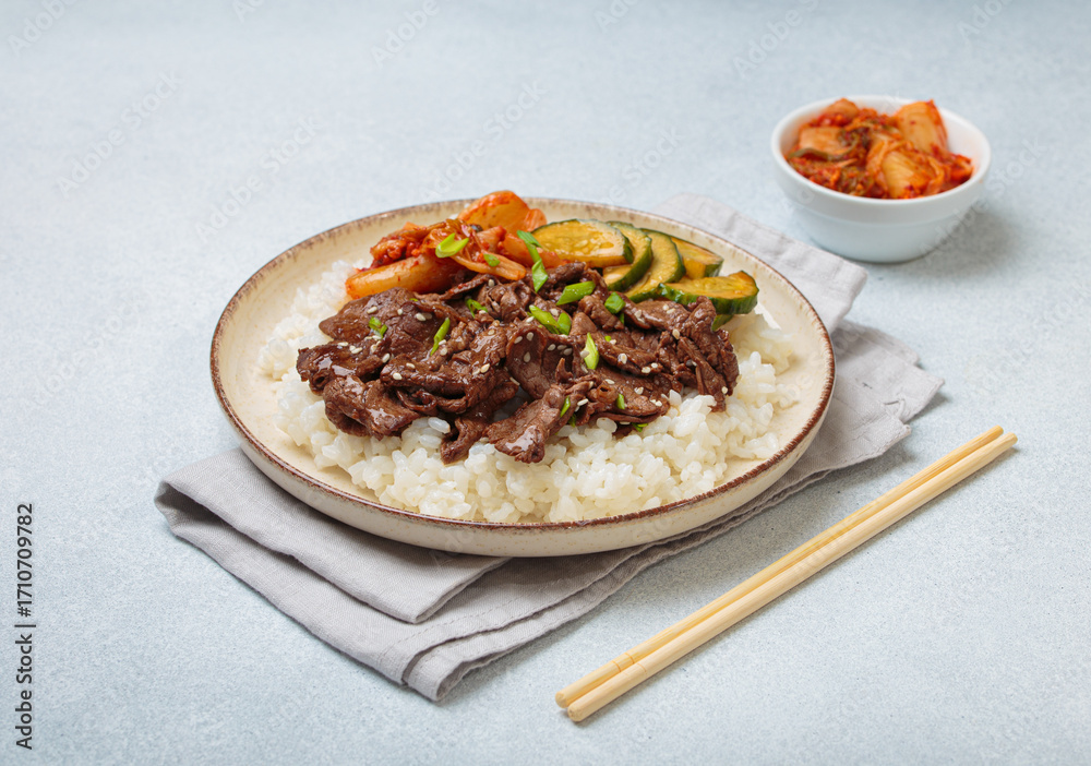 Beef bulgogi bowl dish with rice, roasted meat slices, kimchi and marinated cucumber on white background, traditional dish of Korea