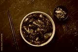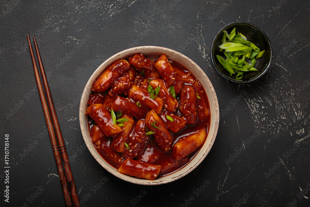 Stir fried rice cakes tteokbokki simmered in spicy sauce, garnished with green onions and sesame seeds, served on a black background with chopsticks top view. Popular dish of Korea