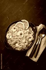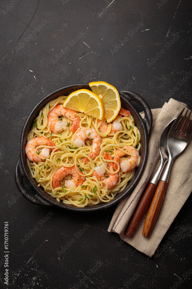 Shrimps pasta spaghetti served in a black cast iron skillet garnished with fresh lemon slices and parsley top view on black rustic background