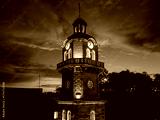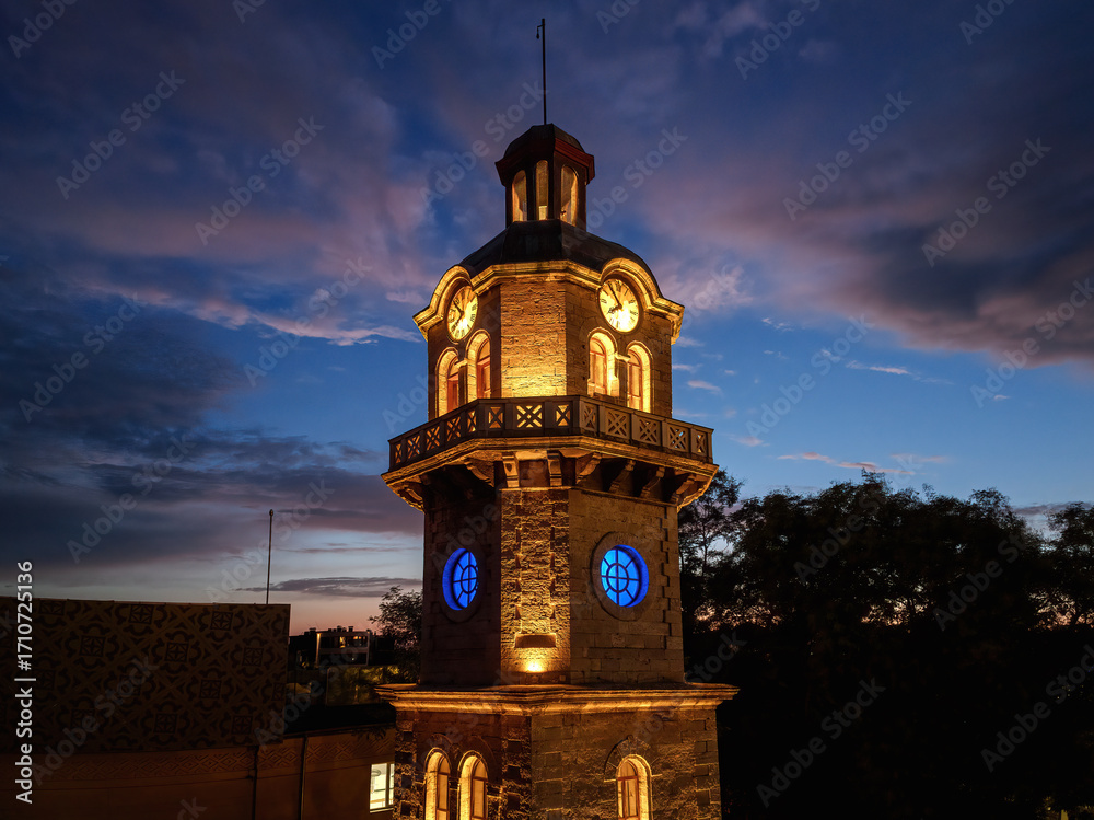 Historical clock tower in the city center of Varna, Bulgaria, aerial night view scene