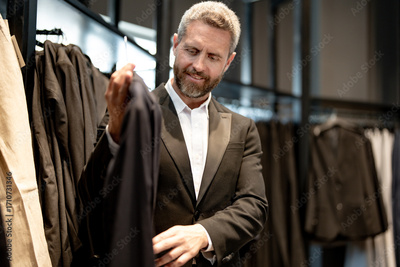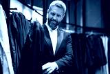 A boutique consultant helps a customer find the perfect suit. A luxury store collection of premium suit designs. Elegant suit is perfect for business man. A well-tailored suit.