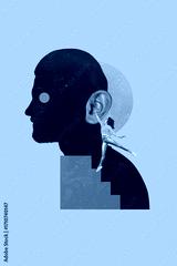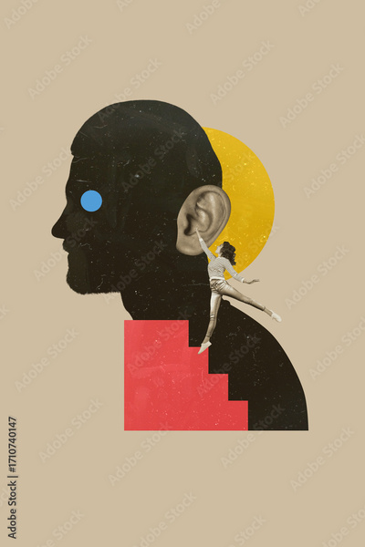 Composite artwork 3D collage trend template of silhouette person young lady stand ladder hold ear think mind thoughts creative inspiration