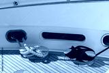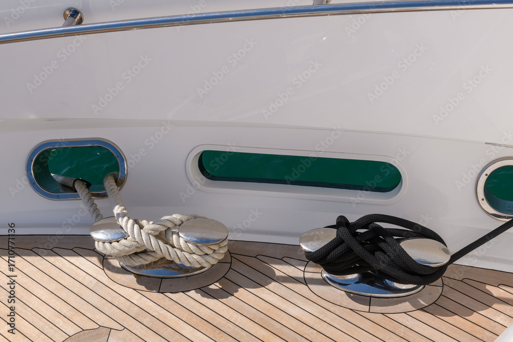 Bollard (cleat) with mooring line on superyacht. Mooring gear on yacht. Superyacht equipment. Side view.