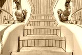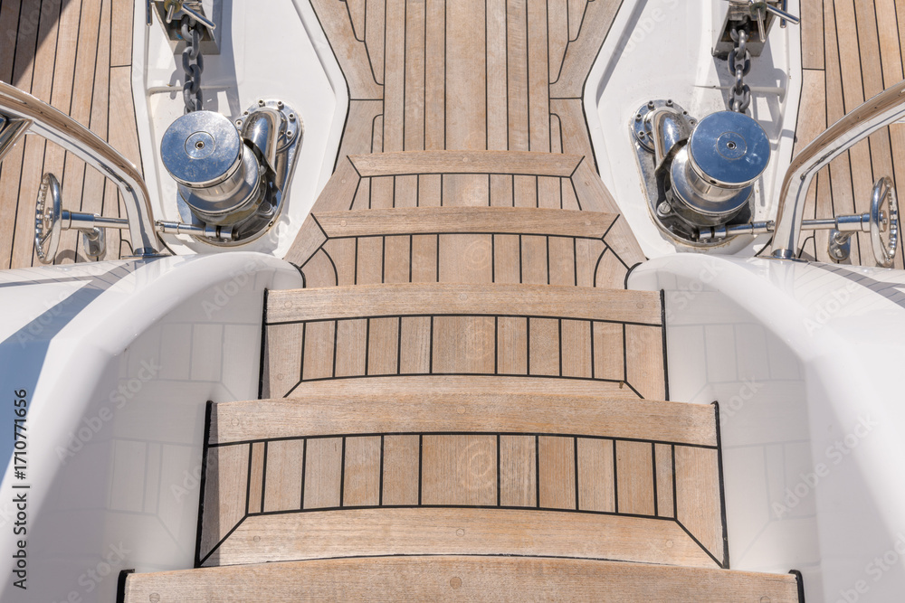 Teak stairs ladder on luxury yacht. Elements of yacht construction. Superyacht concept.