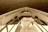 View from the bow deck of a modern luxury yacht with teak wood flooring, stainless steel railings, and nautical ropes. The yacht is sailing on calm blue sea, symbolizing travel