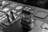 A close-up view of a yacht or ship bridge with the throttle controls. The navigation radar screen and electronic control panels are visible in the background