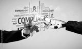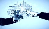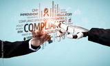 A creative representation of human and robotic hands reaching out to symbolize the intersection of compliance, quality control, and regulatory standards in modern business practices. Tessel