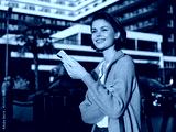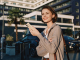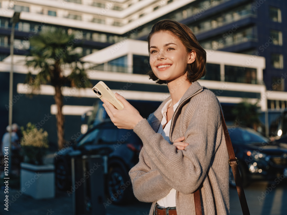 A cheerful professional woman stands outside a modern office building, texting on a smartphone. She smiles warmly, conveying a positive and engaging business atmosphere.