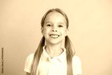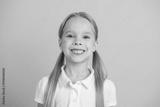 Cheerful schoolgirl smiling against a vibrant yellow background symbolizing youthful energy and education concepts