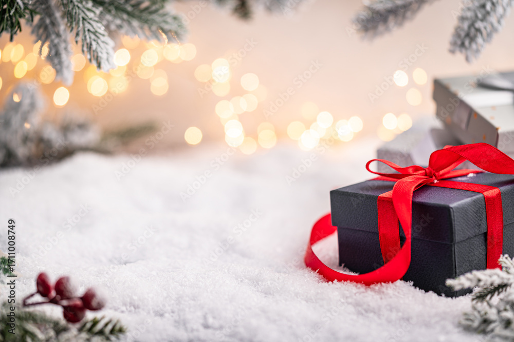 Elegant black present with a red ribbon sits on snow beneath frosted pine branches and festive holiday lights. Winter Christmas Holiday Decoration Background