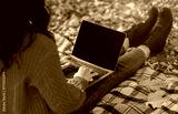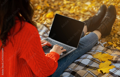 Young woman using laptop with blank screen at autumn park, mockup for your website design. Millennial lady working on portable PC outside, space for landing page template