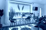 modern home with table chairs plants large window with a desert view joshua tree california