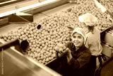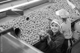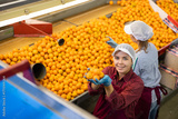 View from above of happy young female worker of fruit sorting factory holding handful of fresh ripe tangerines in hands while standing near sorting production line ..