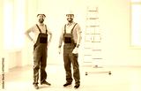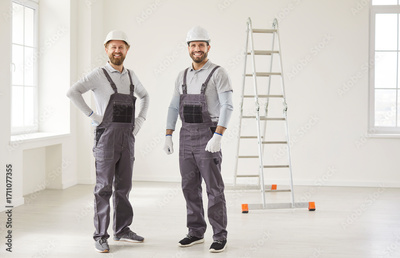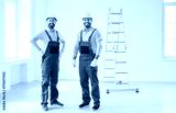 Repair team, restoring workers on construction project, building architectural plan, real estate object for renovation, property reconstruction, recreating, renewing room professional portrait