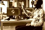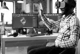 African american man wearing VR headset while seated at desk, remotely creating 3d clamps prototypes for construction company. Innovative design process using virtual reality tools.