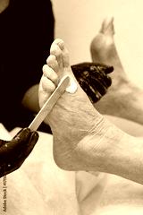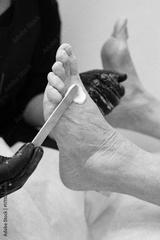 Elderly woman gets foot massage from beautician. Beautician applies scrub to feet. Rejuvenating pedicure for seniors. Self-care.