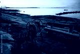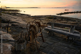Rustic seaside sunset with old fishing equipment and wooden bench on rocky shoreline by White Sea, Russian Karelia, landscape and northern nature