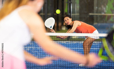 Young asian woman in orange t-shirt playing padel tennis indoor
