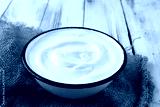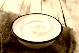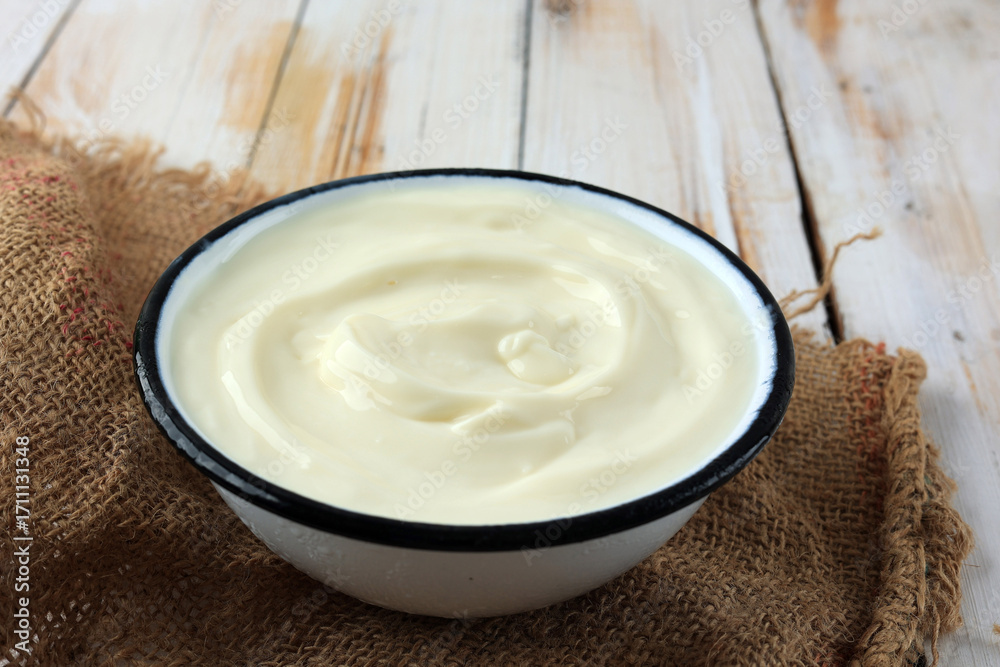 Greek Yogurt in a Enamel White Bowl with on Rustic Wooden Plate.