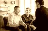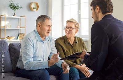 Senior couple, family buyers or sellers visiting realtor, agent, discussing insurance agreement, real estate contract, adult elderly meeting with lawyer, solicitor, broker common deal, help, advice