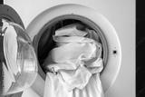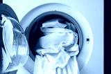 Washing machine with bed sheets in laundry room, closeup