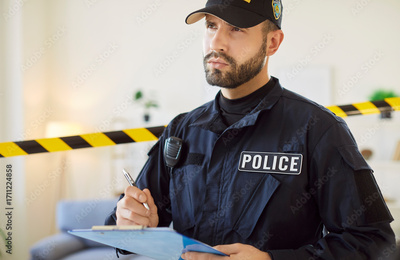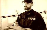 Police officer is actively engaged in documenting information at crime location. Man dressed in standard police uniform holds clipboard and takes notes while interviewing witnesses to crime scene.